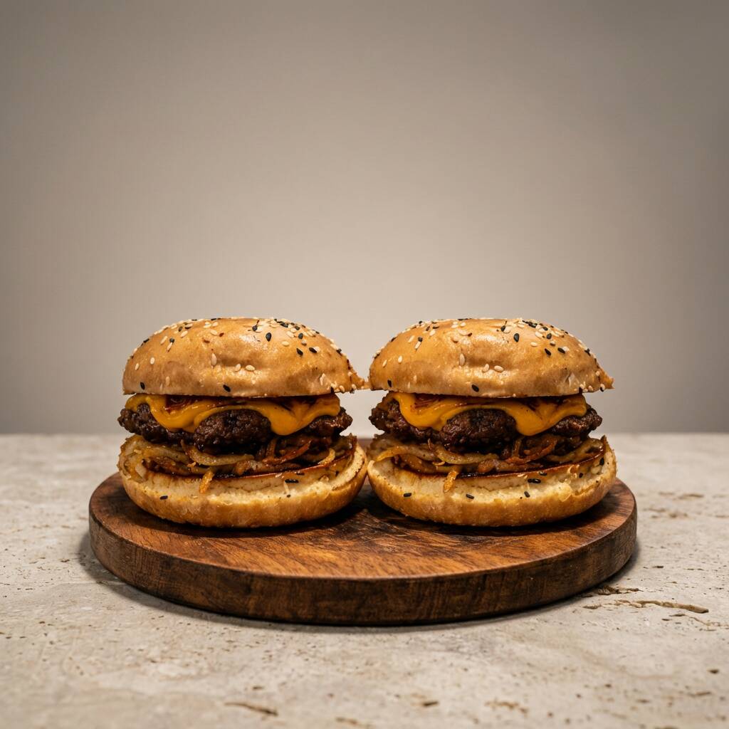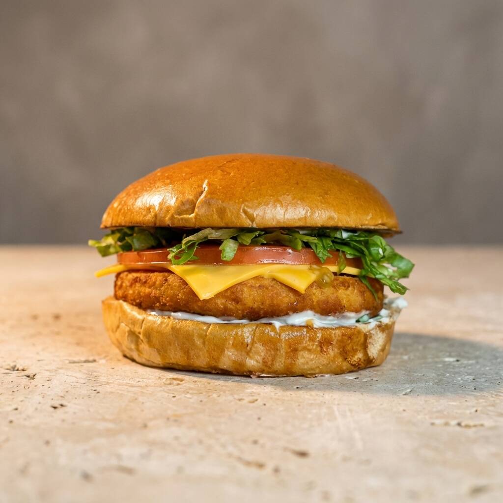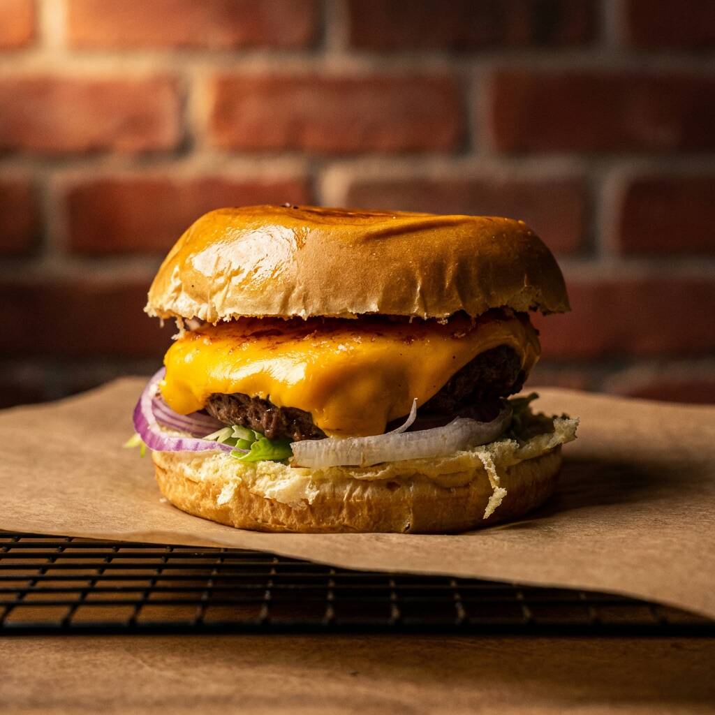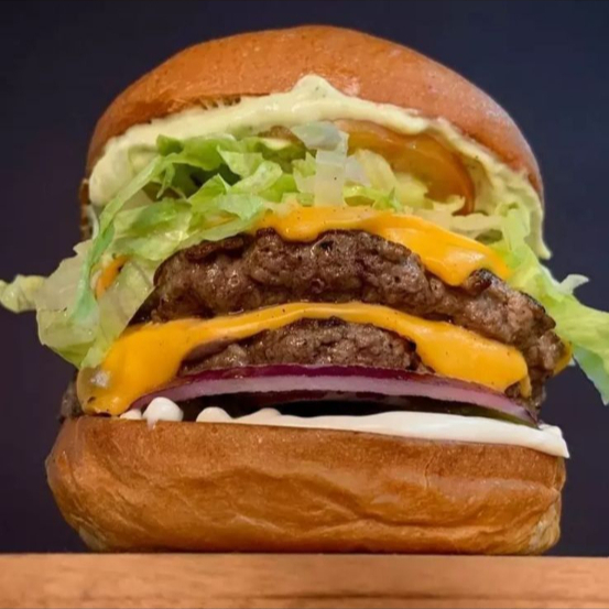 Pão bola, carne de hambúrguer, queijo cheddar, molho especial e salada
