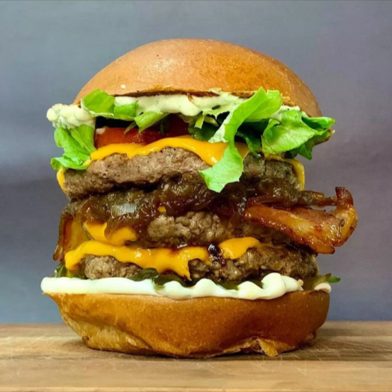 Pão bola, 3 carnes de hambúrguer, presunto, molho especial e salada
