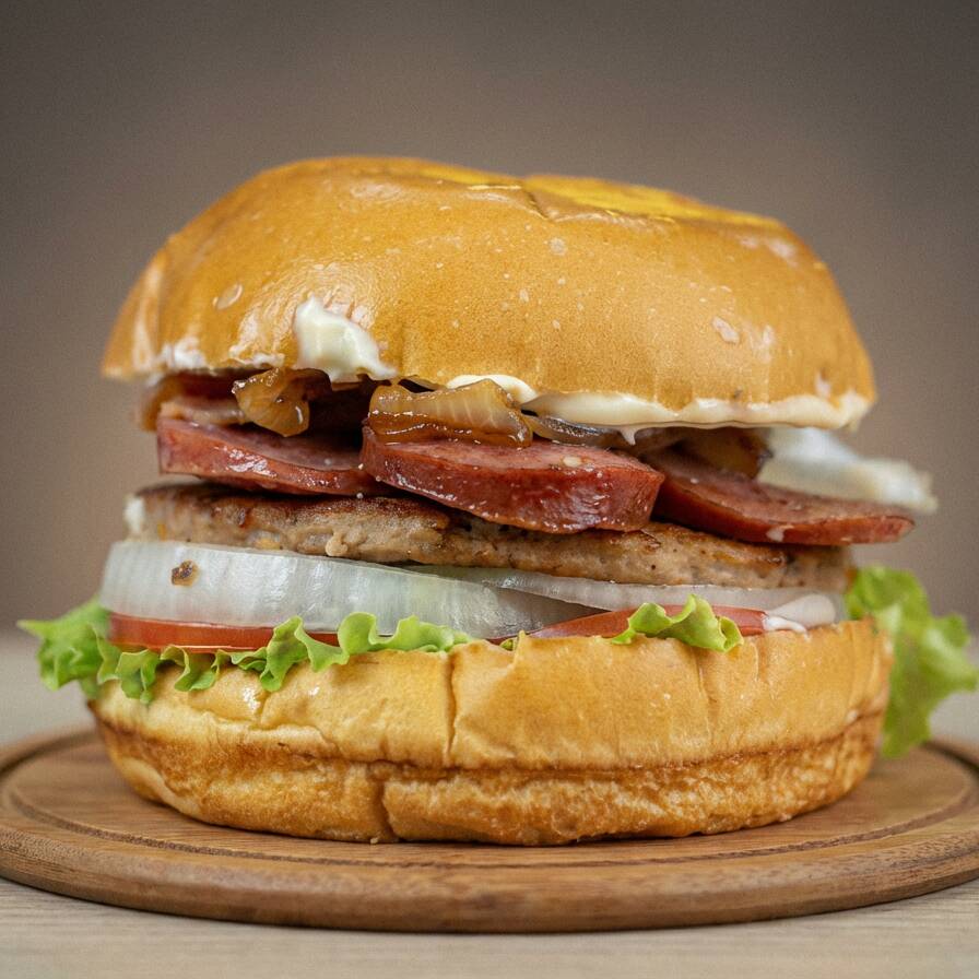 Pão bola, carne de hambúrguer, queijo, presunto, calabresa, molho especial e salada