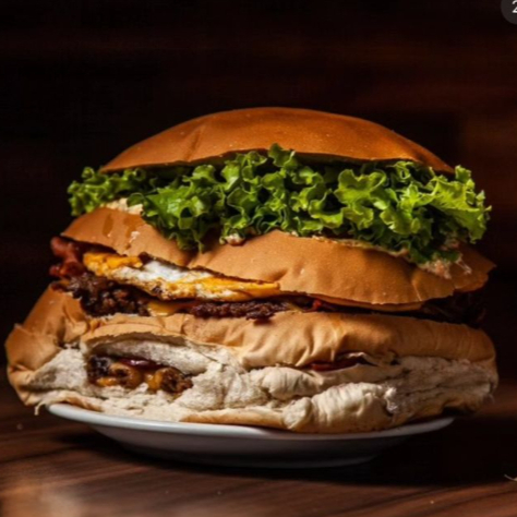 Hamburgão Moda da Casa com Batata - 4 carne de hambúrguer, ovos, salsicha, queijo, presunto, frango, bacon, calabresa, molho, salada + batata serve bem 4 pessoas.