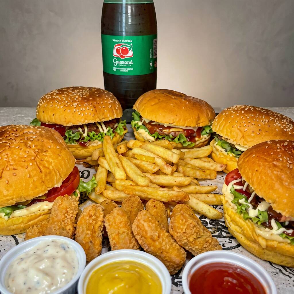5 hambúrgueres saborosos, 10 nuggets de frango crocantes, batata frita e Guaraná 1L bem gelado. Um combo completo e perfeito para compartilhar! 😋