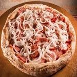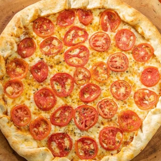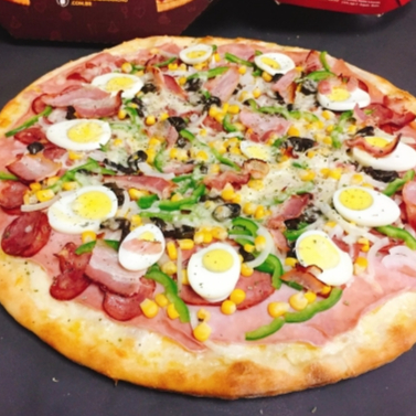 Molho de tomate, queijo mussarela, presunto, ovo, cebola e orégano