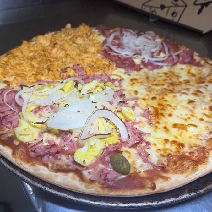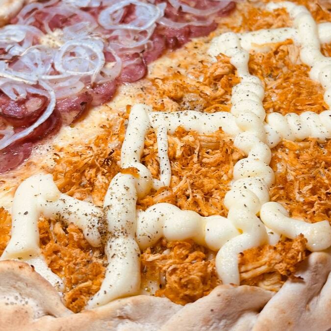 Molho de tomate, queijo mussarela, calabresa, frango, portuguesa, cebola e oregáno