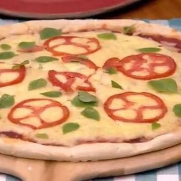 Mussarela, calabresa, tomate , cebola e orégano. é Meio calabresa e meio mussarela
