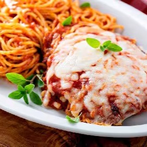 Para 1 pessoa. Macarrão ao molho de tomate da casa, 1 filé de frango empanado coberto de queijo mussarela, acompanhado com uma porção de batata frita de 200g