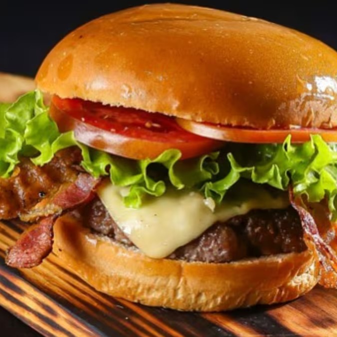 Pão tradicional alface, tomate, cebola caramelizada, 120gr de carne bovina, Bacon, mussarela e molho especial.