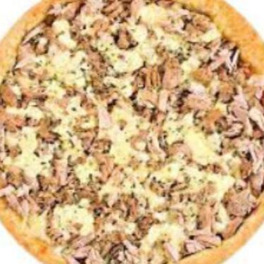 Base com molho de tomate cobertura com mussarela, frango , presunto, calabresa,cebola, azeitona, orégano e azeitonas.