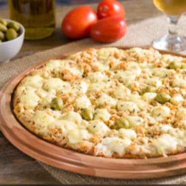 Base com molho de tomate cobertura com mussarela, frango, Catupery, azeitona, orégano e azeitonas.