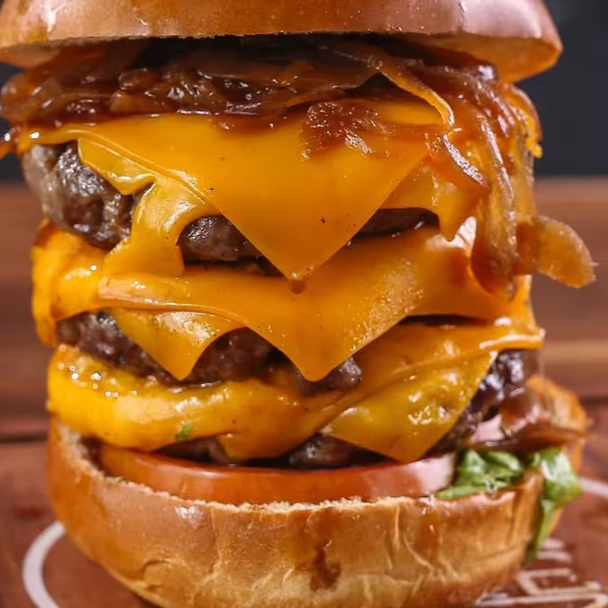 Pão tradicional alface, tomate, cebola caramelizada, 2x 120gr de carne bovina, 2xqueijo Cheddar, 2x ovos, 2x presunto e molho especial.
