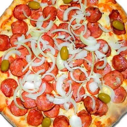Base com molho de tomate cobertura com mussarela, calabresa defumada, cebola, azeitona, orégano e azeitonas.