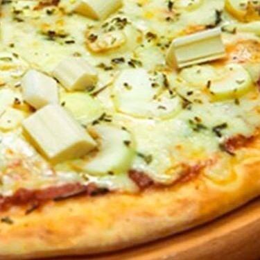 Base com molho de tomate cobertura com mussarela, palmito,cebola, azeitona, orégano e azeitonas.