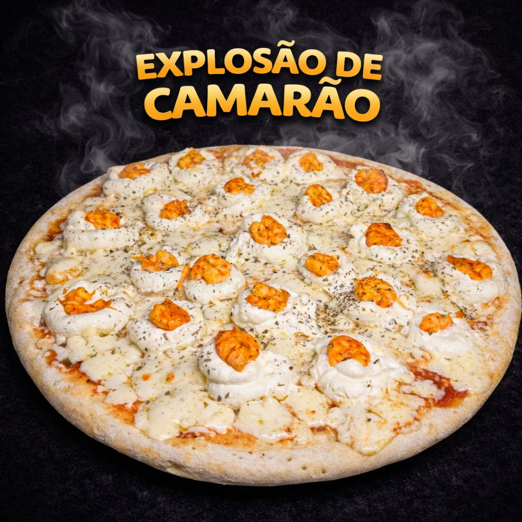 Massa Tradicional, Molho Italiano, camarão (sem casca), Cream Cheese, cebolas, Azeitona e Oregazo.