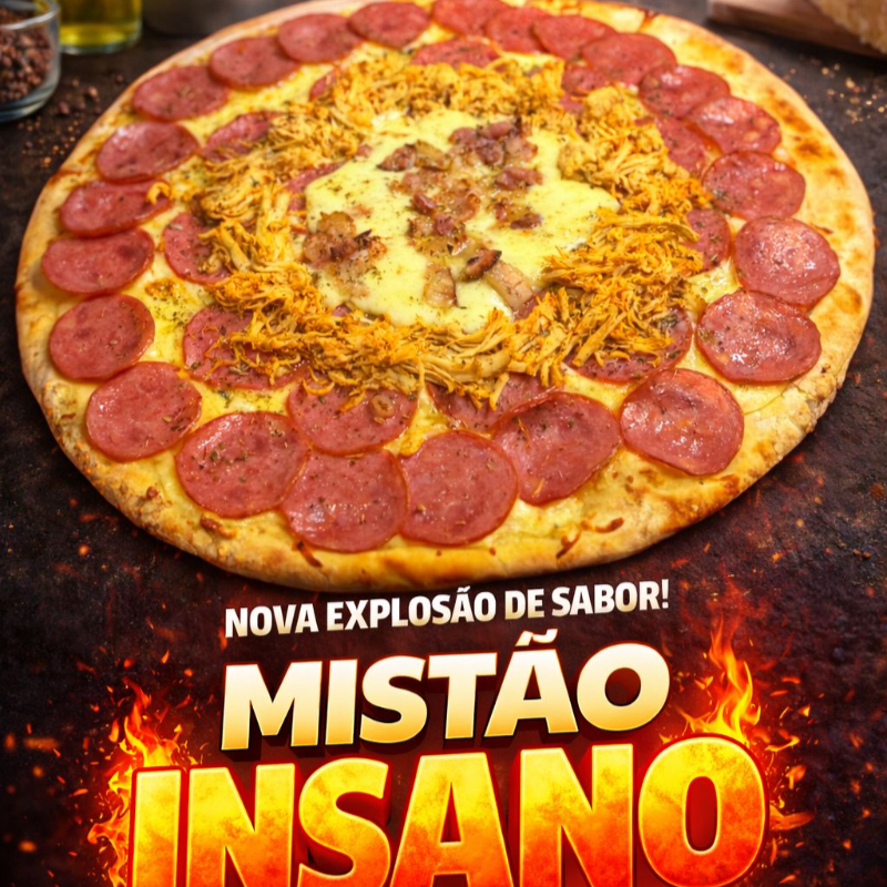 Massa Tradicional, Molho Italiano, Calabresa Ralada, Mussarela, Cheeda, Catupiry, Azeitona e Orégano.
