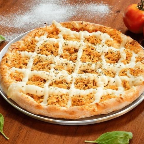 Molho de tomate, frango desfiado, mussarela, catupiry, azeitonas e orégano