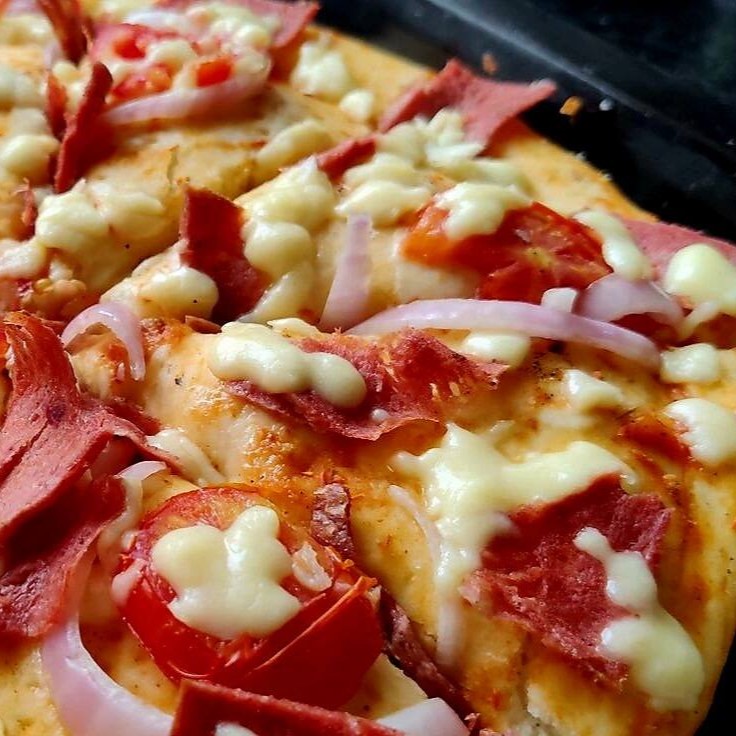 Molho de tomate, mussarela, presunto, calabresa, cebola, pimentão ovo cozido, finalizada com azeitonas e orégano.