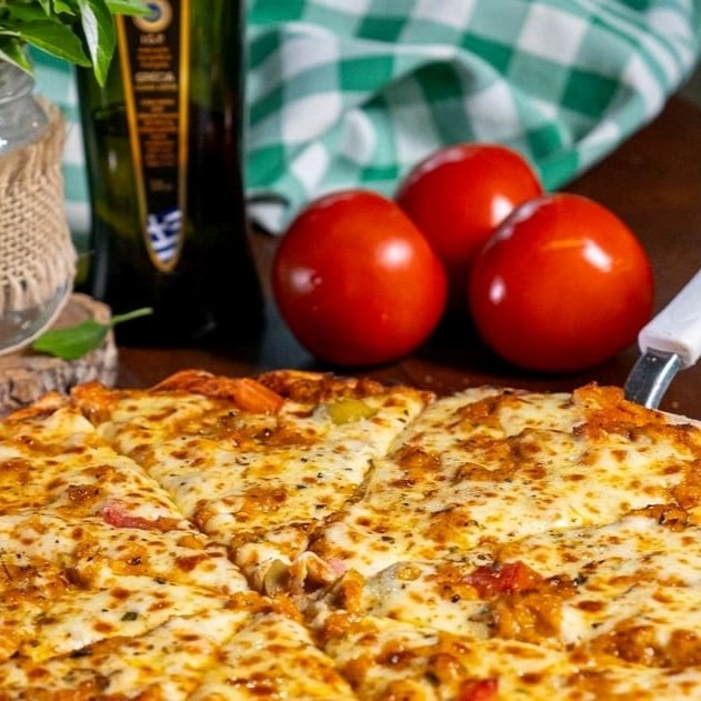 Molho de tomate, mussarela, calabresa, cebola, creme de alho caseiro, azeitonas e orégano