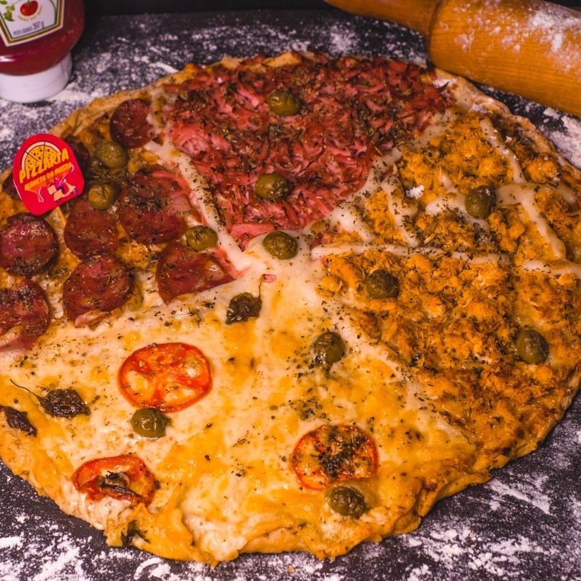 Massa artesanal, molho de tomate da casa, mussarela, cheddar, cream cheese e finalizada com orégano.
