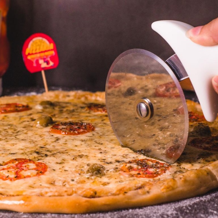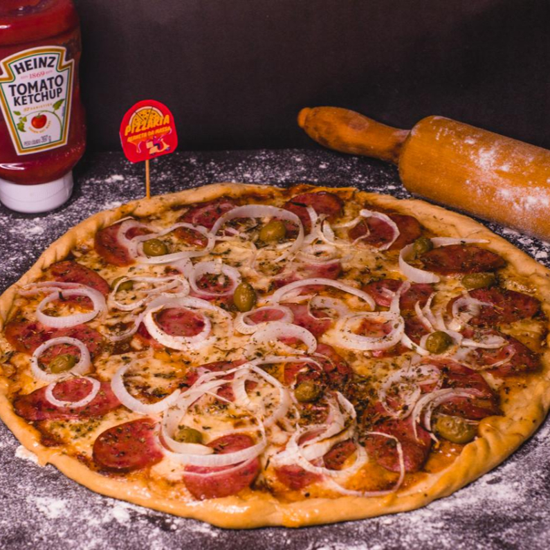 Massa artesanal, molho de tomate da casa, calabresa defumada, mussarela argentina, e finalizada com cebolas e oregano.