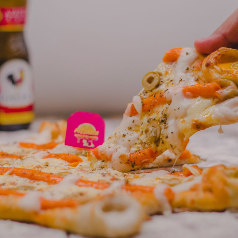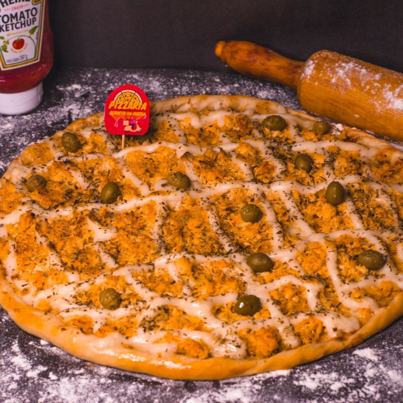 Massa artesanal, molho de tomate da casa, frango, milho & ervilha, cebolas, mussarela e finalizada com orégano.