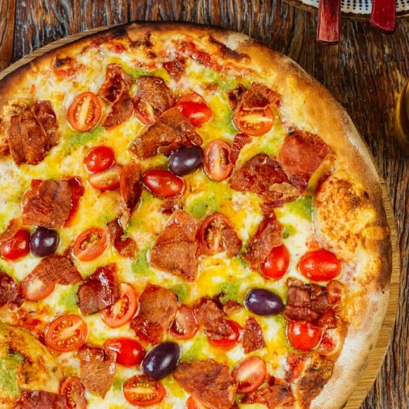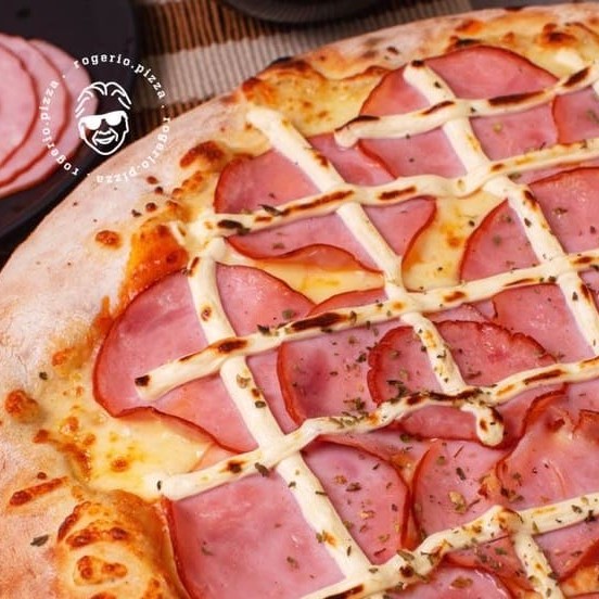 Pizza preparada com: Lombo Suíno, Molho de Tomate, Mussarela, Cebola, Milho, Azeitona, Orégano, Cream Chesse. Pizza Grande - 8 pedaços