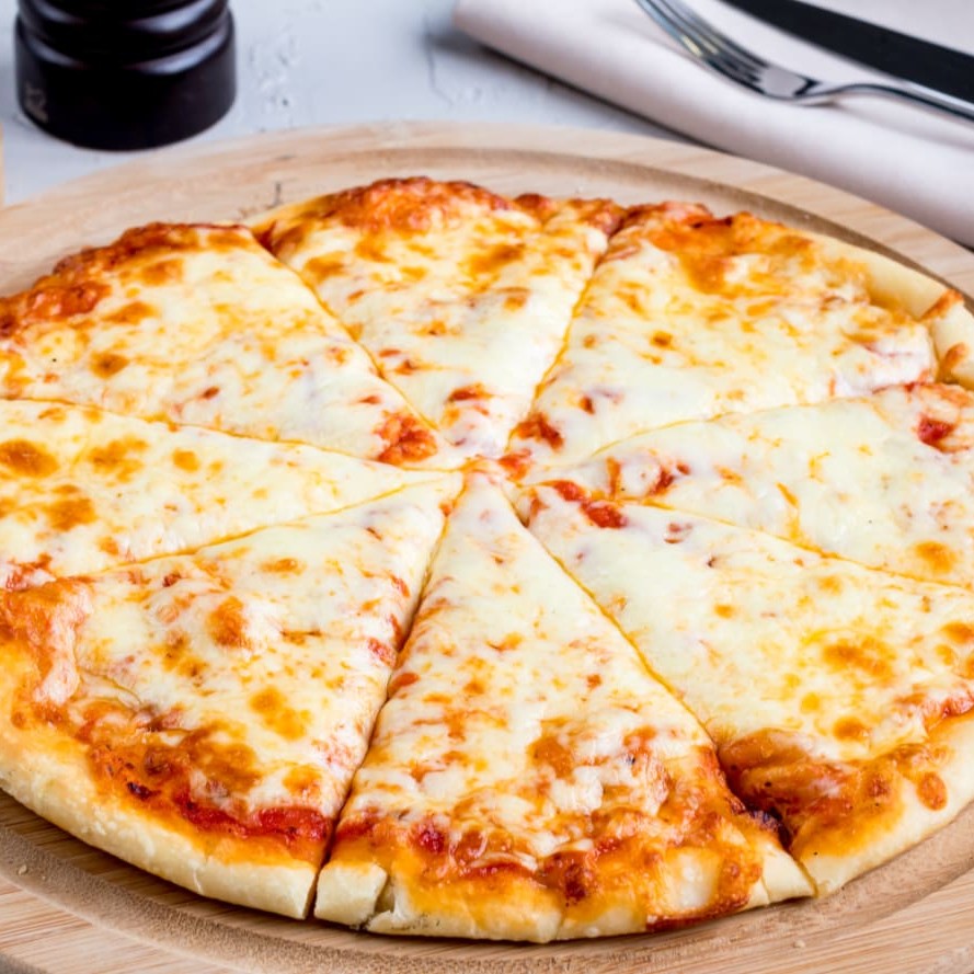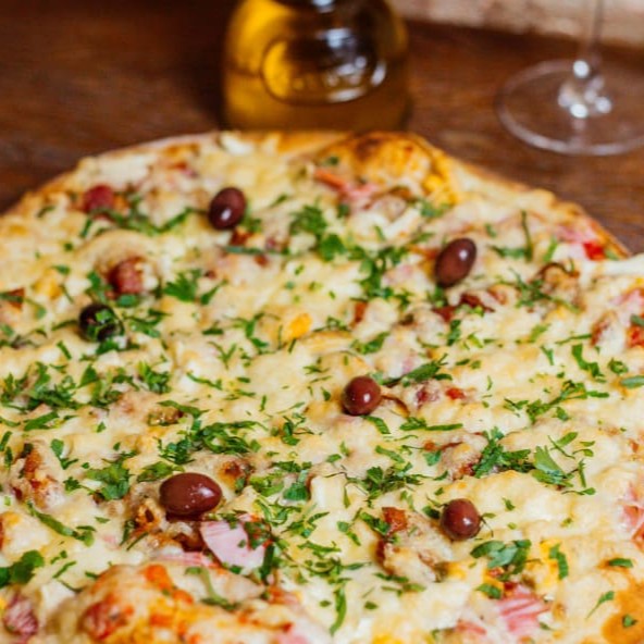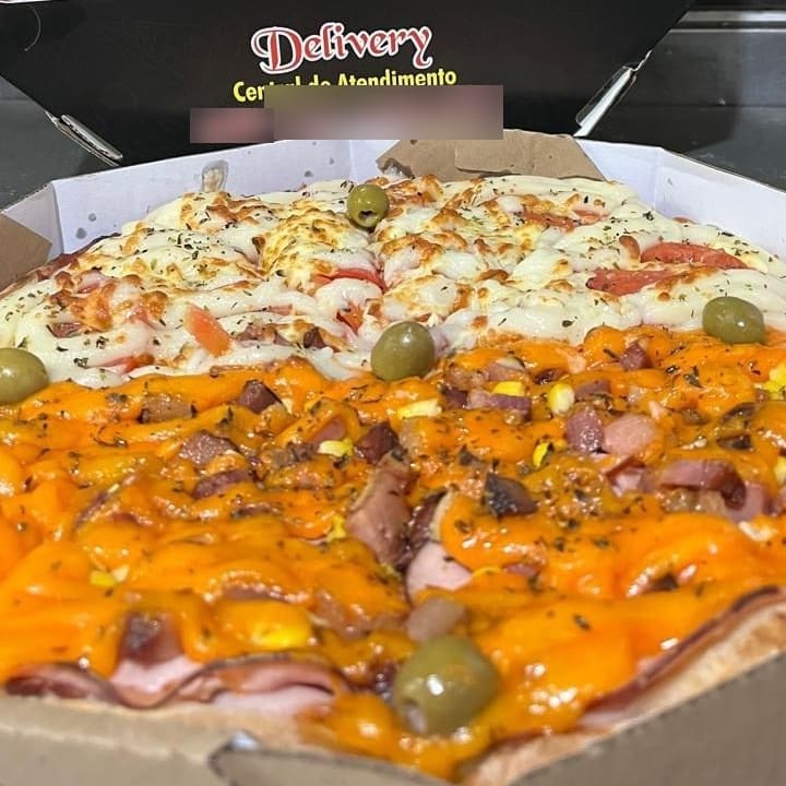 Pizza preparada com: Queijo mussarela, Cheddar, Requeijão, Azeitona, Orégano, Milho, Ervilha, Azeitona e Cebola. Tamanho Grande - 8 pedaços