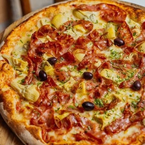 Pizza preparada com: Queijo mussarela, Presunto, Orégano, Milho, Ervilha, Azeitona e Cebola. Tamanho Broto - 20 centímetros