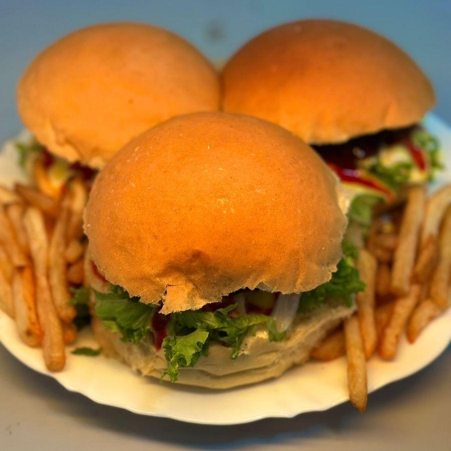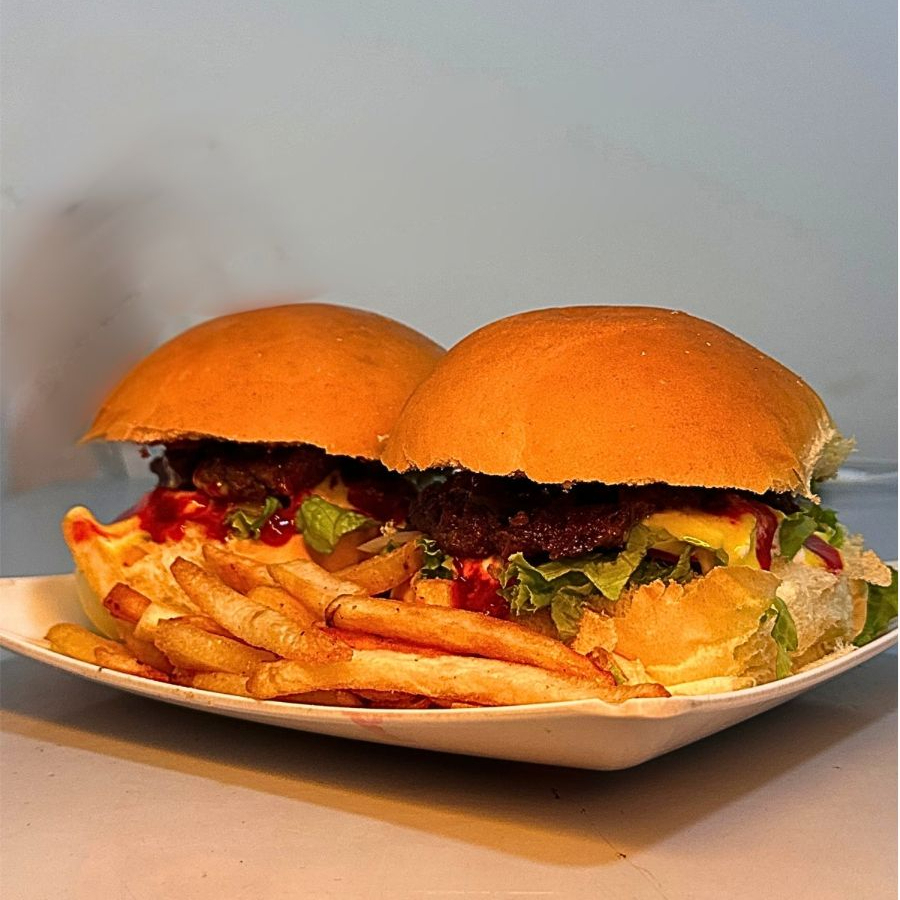 02 Hamburguer, porção de batata frita, tomate , cebola,alface,maionese,ketchup,barbecue.