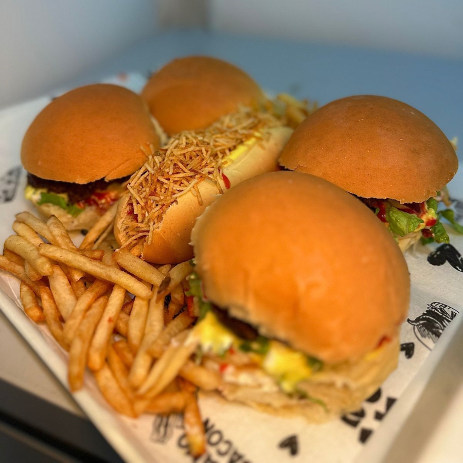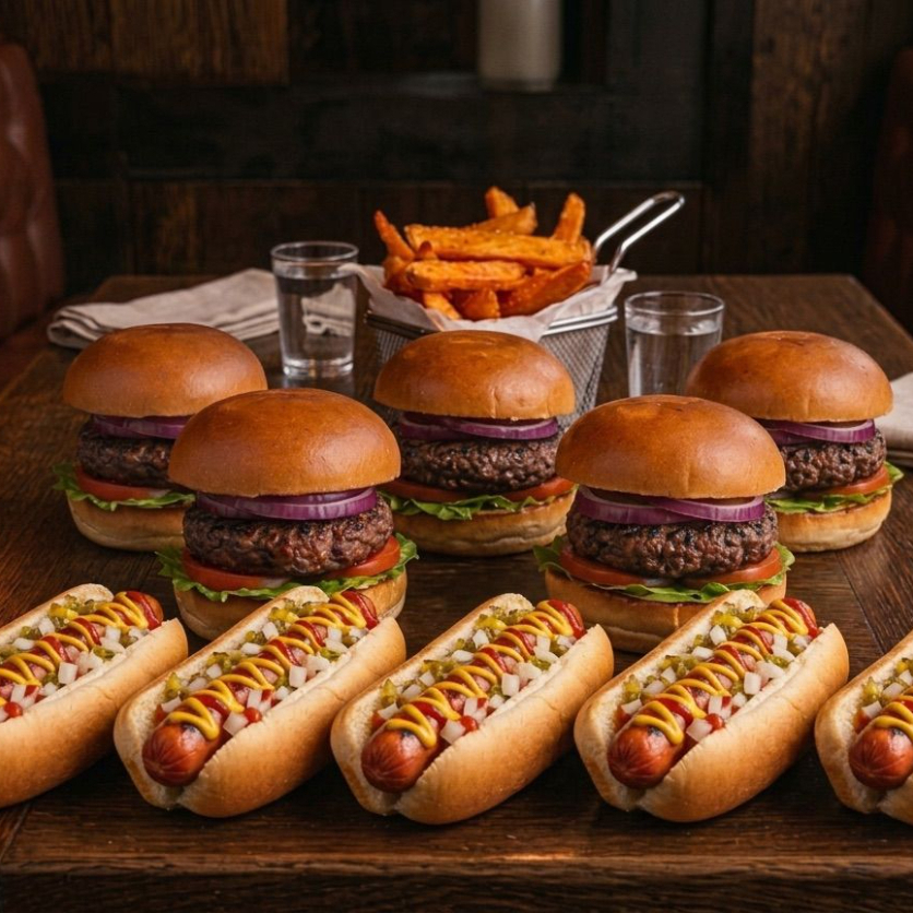(imagem meramente ilustrativa). 05 hambúrguer artesanal + 05 cachorro quente + porção de batata frita,tomate,cebola,alface,mostarda,ketchup,maionese,barbecue.