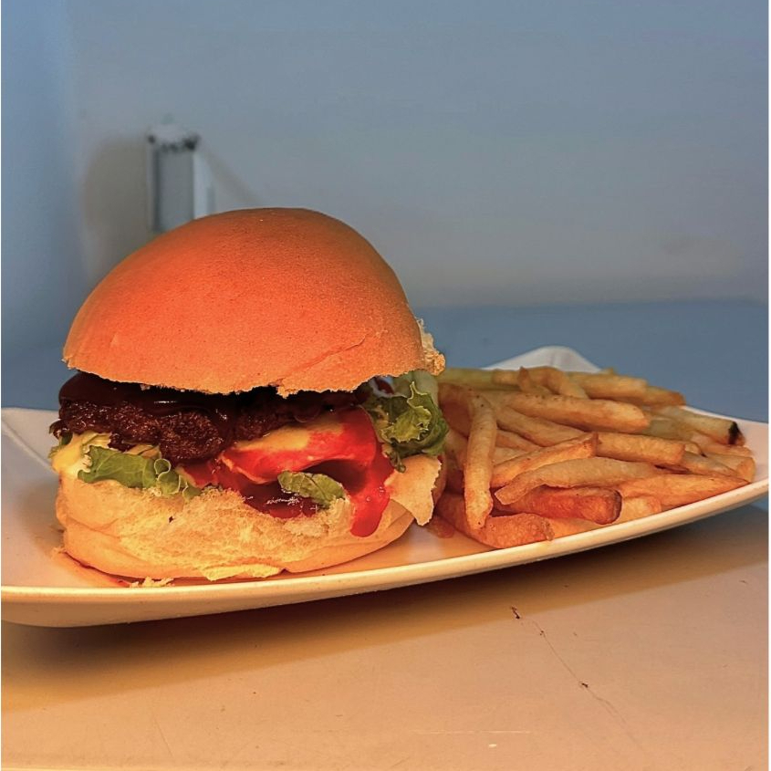 01 hambúrguer artesanal e 01 porção de batata, tomate,cebola,alface,ketchup,mostarda,maionese,barbecue.