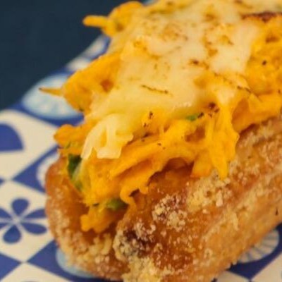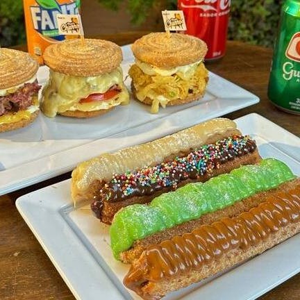 Dois discos de churros injetados de molho especial da casa, creme de frango com requeijão, bacon e queijo muçarela maçaricado.