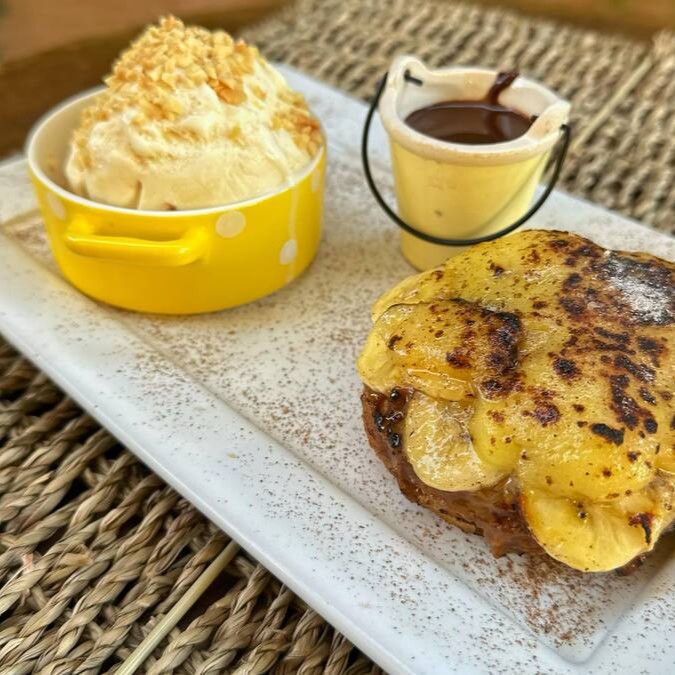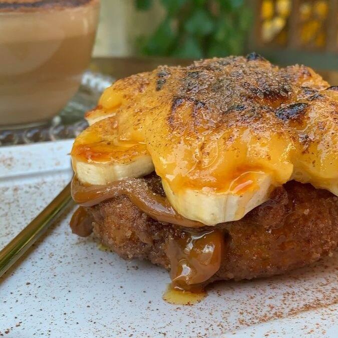 Disco de churros injetado de doce de leite, banana caramelizada, queijo de manteiga derretido, açucar e canela.