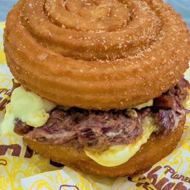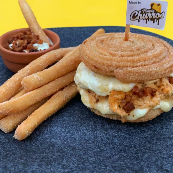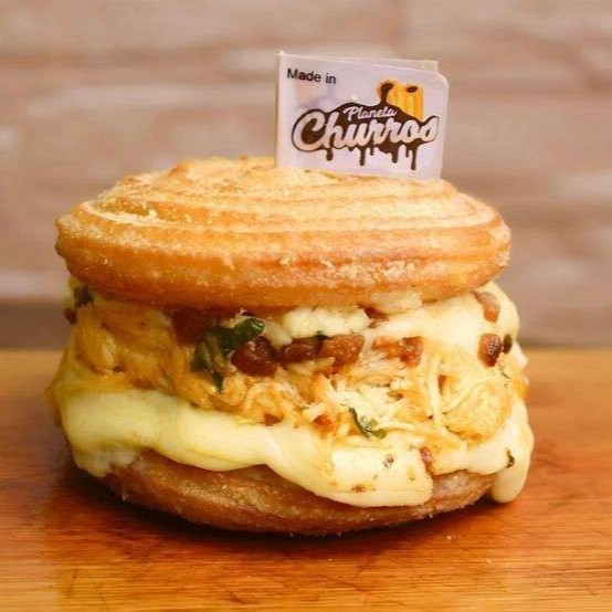 Dois discos de churros com massa salgada, injetados de molho especial da casa, frango bem temperado com requeijão, bacon e queijo muçarela maçaricado. Criacão do Planeta.