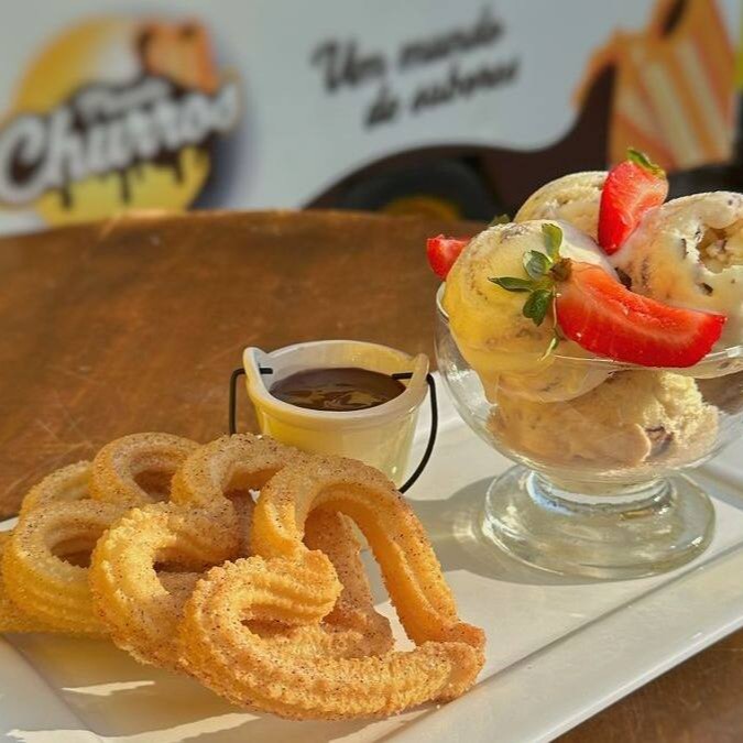 4 Bolas De Sorvete cremoso à Sua Escolha + 1 Calda de chocolate nobre +1 topping + 4 churros Churros Quentinho Crocante.