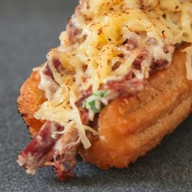 Dois discos de churros, charque salteada na manteiga, cebolinho, cream cheese, bacon, molho especial e queijo muçarela maçaricado.