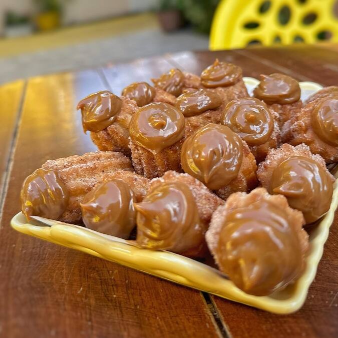 12 mini churros que derretem na boca, sequinho e crocantes, recheados com o melhor doce de leite do Planeta