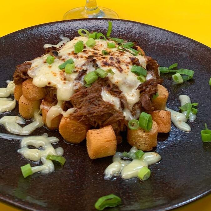 Nhoque de churros frito de queijo Parmassão com Ragú bovino e queijo muçarela maçaricado.