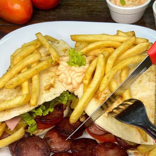 Pão sírio , 150g de calabresa defumada , queijo prato , presunto , salada , molho especial e 150g de batata frita.