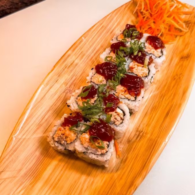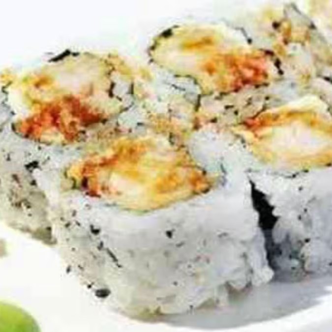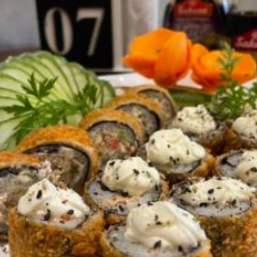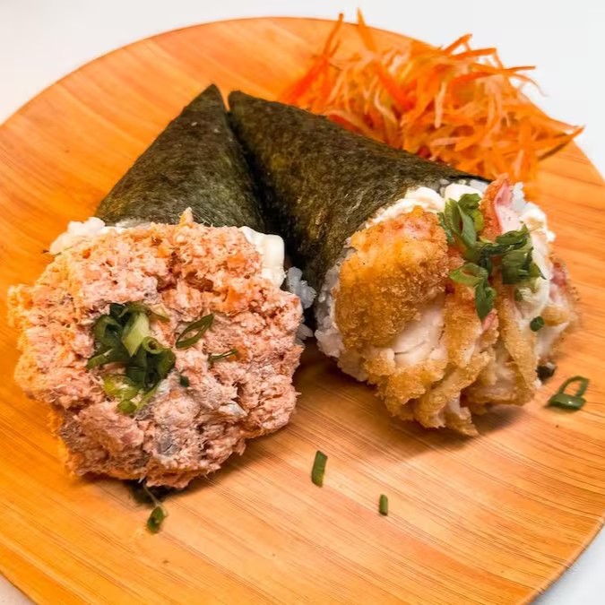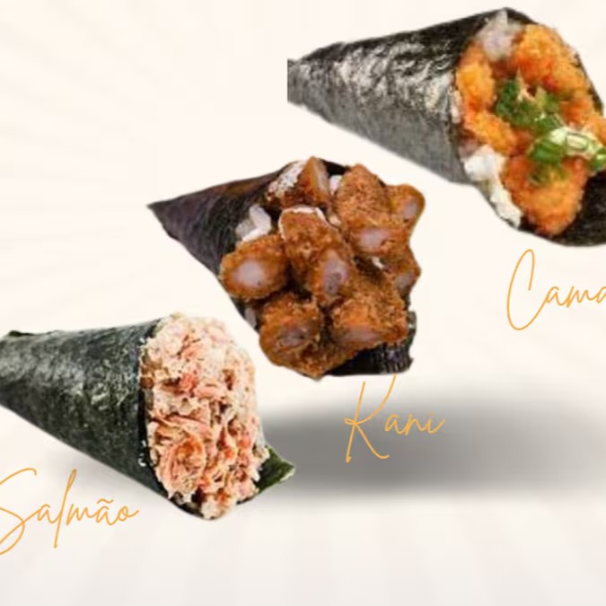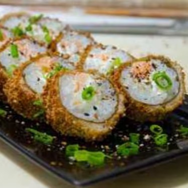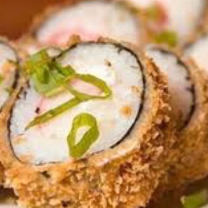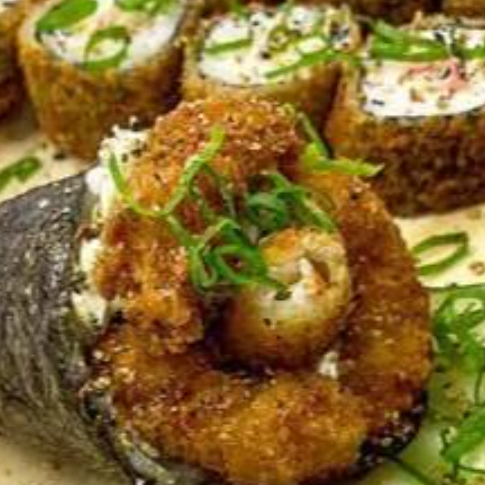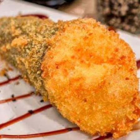 Arroz enrolado na massa empanada e crocante, com recheio de kani e cream cheese.