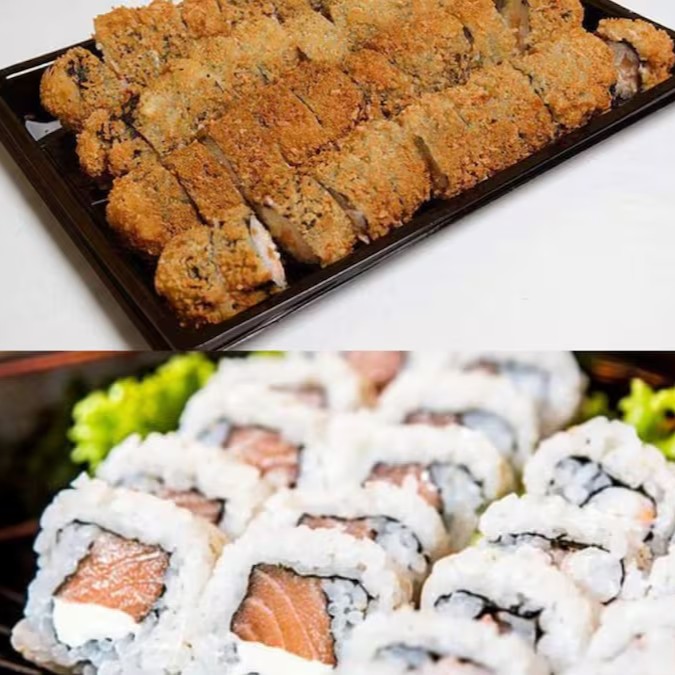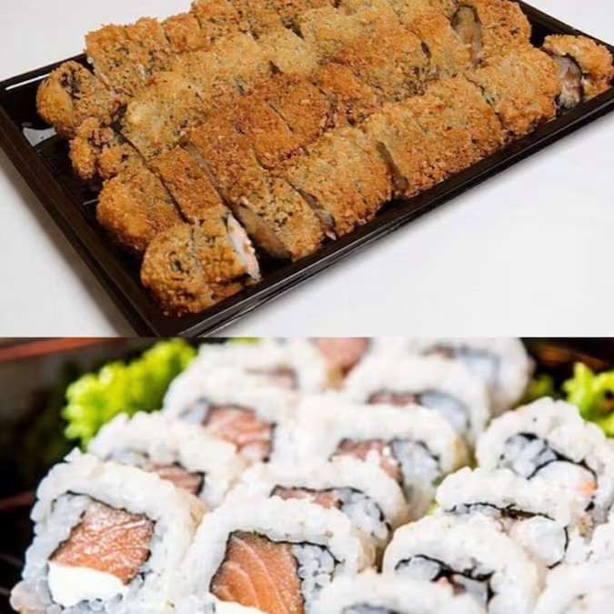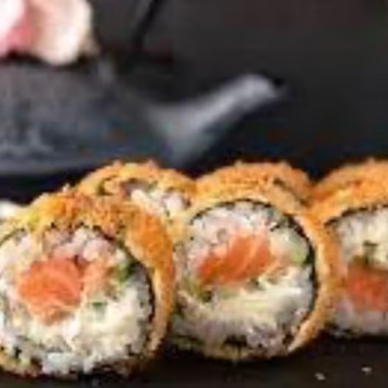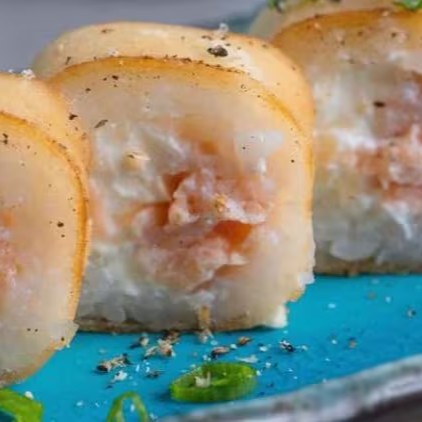 Arroz enrolado na massa empanada e crocante, com recheio de pasta de salmão e cream cheese.