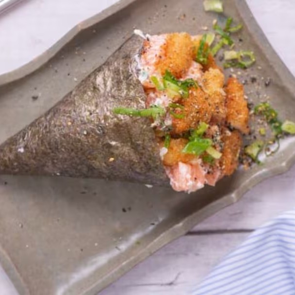 Temaki na alga recheado com arroz, salmão, camarões empanados, cream cheese e cebolinho.