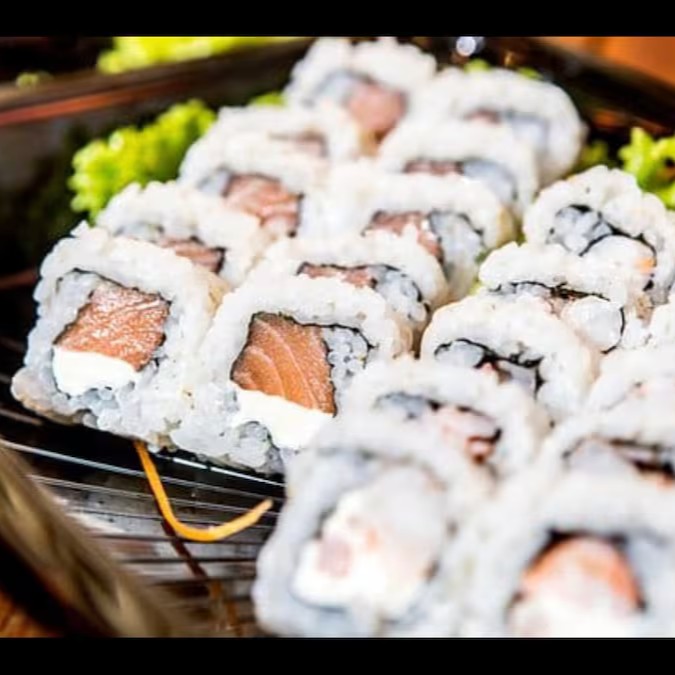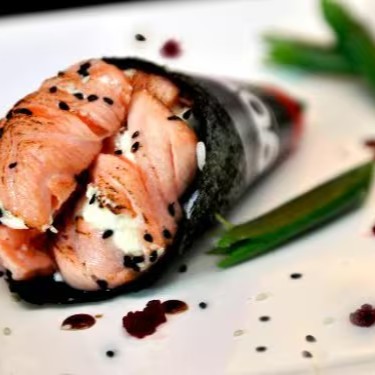 Arroz enrolado no nori com recheio de salmão e cream cheese, finalizado com lâmina de salmão por cima.
