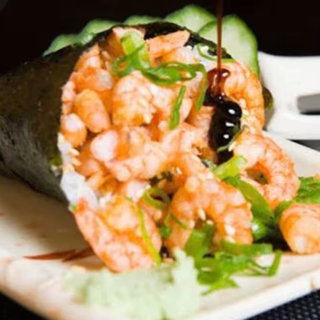 Temaki na alga recheado com arroz, camarão cozido, cream cheese e cebolinho.