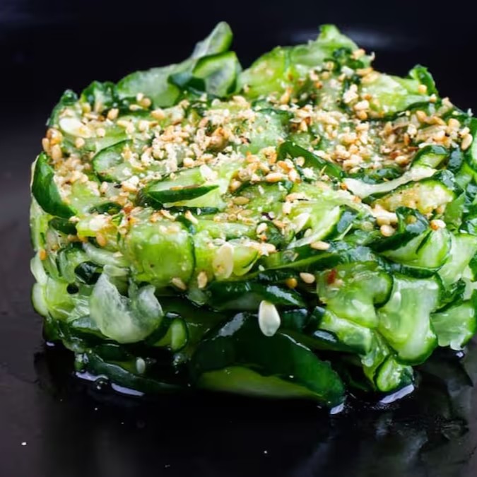 Sunomomo: Fatias finas de pepino agridoce, que adicionam frescor e leveza ao prato.