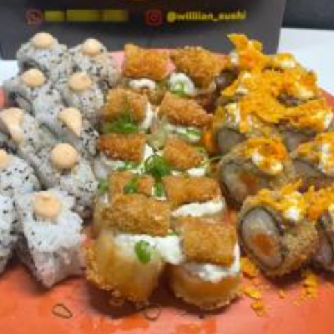 Massa de harumaki recheada de salmão, kani, camarão empanado e cream cheese.