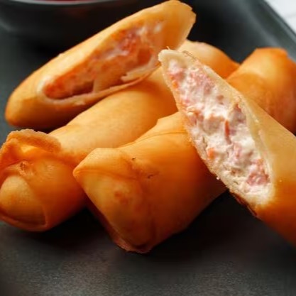 Massa de harumaki com recheio de camarão cozido, cream cheese e cebolinho.