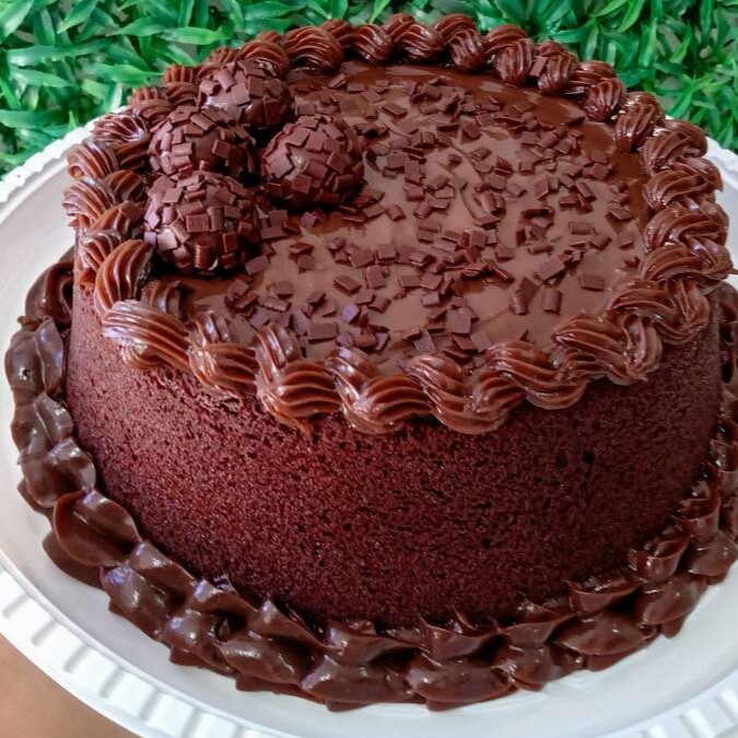 Bolo de chocolate com massa super fofinha, úmida e chocolatuda, com cobertura de creme de chocolate e brigadeiro de chocolate.