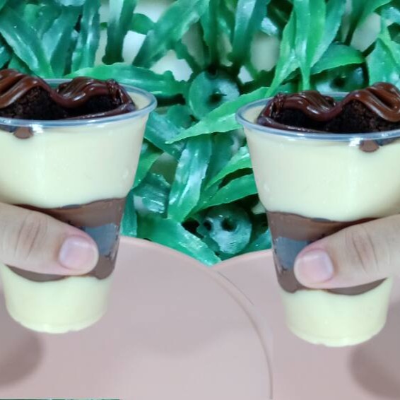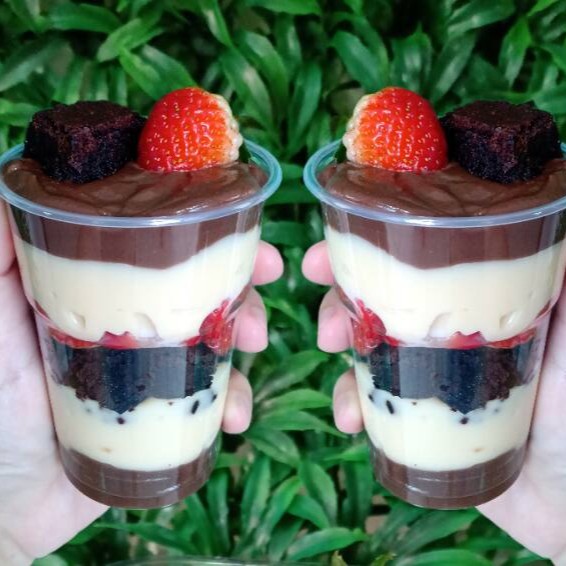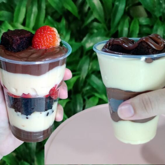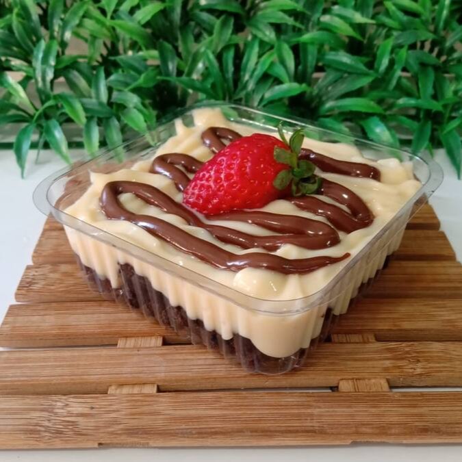 2 copos irresistíveis com creme de chocolate, creme de Ninho, uma camada do melhor brownie, mais uma camada de morangos picados finalizado com brownie e morango.