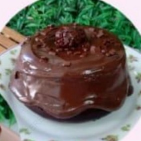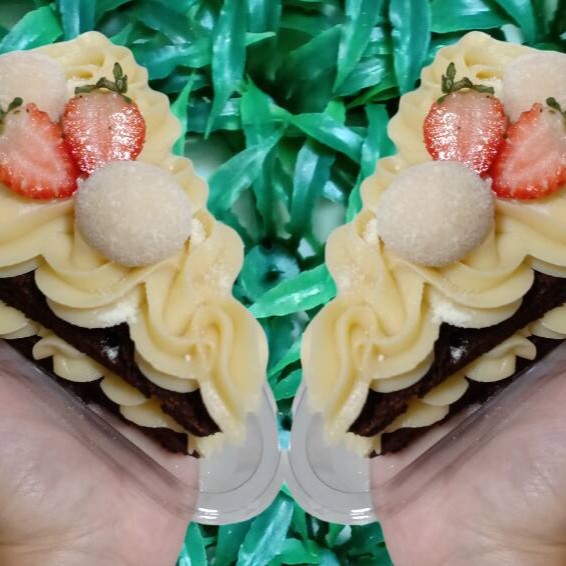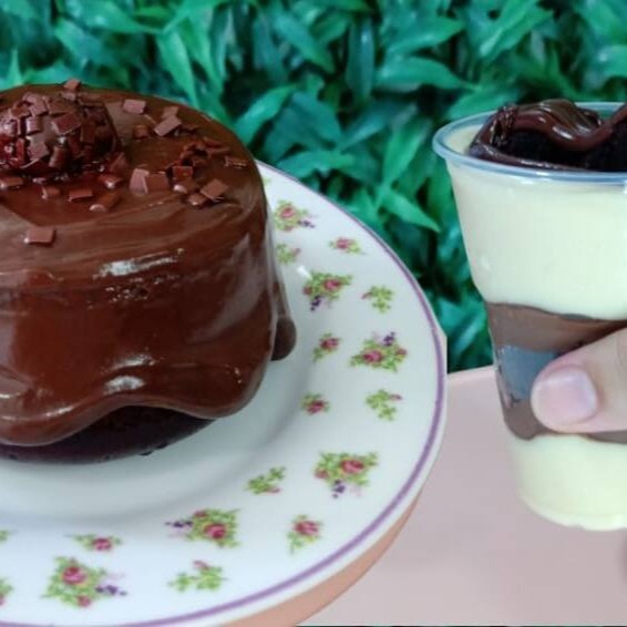 2 mini caseirinhos com massa de chocolate bem fofinha e bastante úmida, com cobertura de creme de chocolate finalizado com brigadeiro e brownie.