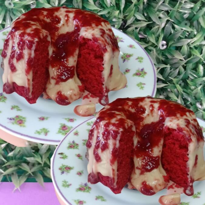 Dois deliciosos caseirinhos com massa super fofinha e amanteigada, com um sabor surreal que só o red Velvet tem! Com cobertura de creme de Ninho e uma deliciosa hele artesanal de morango.