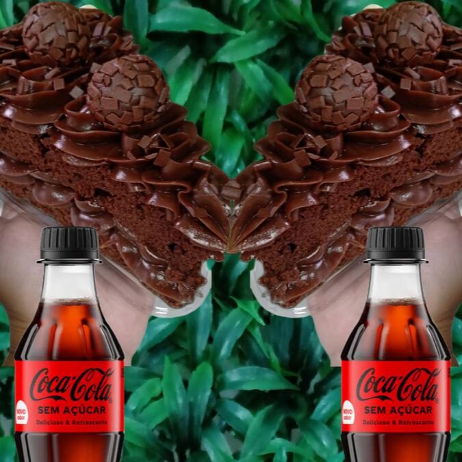 Duas fatias de bolo de chocolate bem fofinha e úmida com recheio e cobertura de brigadeiro de Ninho bem cremoso + duas Coca-Cola bem geladinha.